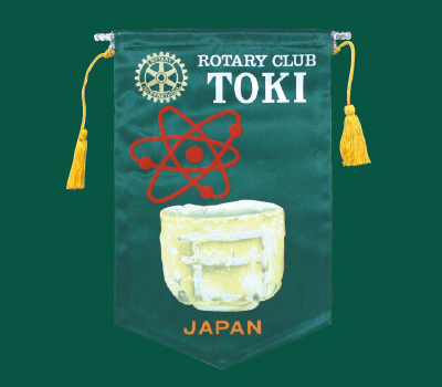 土岐ロータリークラブのバナーは、会員の(株)山加商店考案による由緒正しい土岐市の誇る天正18年の陶祖、四郎左衛門尉景延公の古陶器をメインとし、美濃焼の産地として知られる、土岐市を象徴しています。